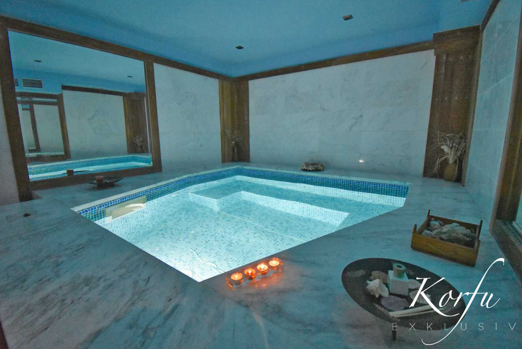 Haupthaus Untergeschoss: sehr großzügiges Marmorbadezimmer, Fitnessbereich, Sauna, großer beheizter Whirlpool sowie ein Weinkeller